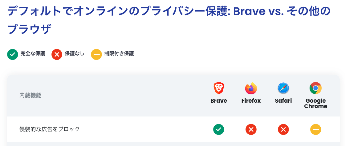 Braveの主な特徴を下記にまとめてみました。