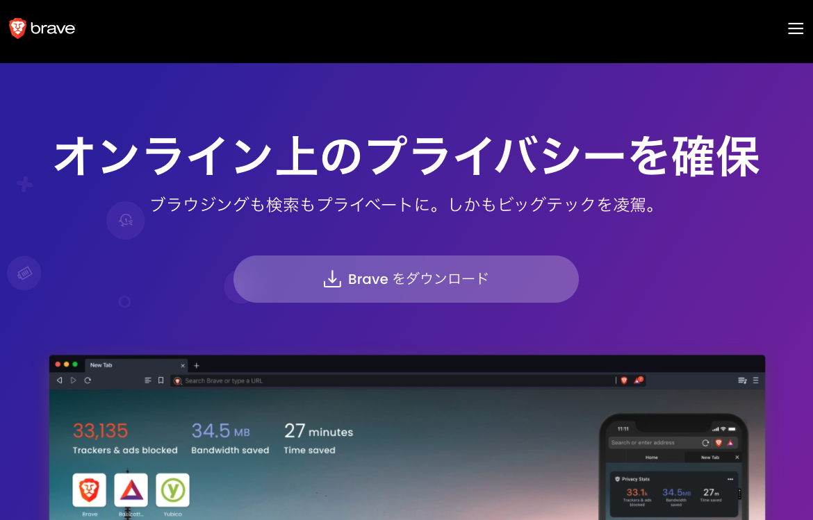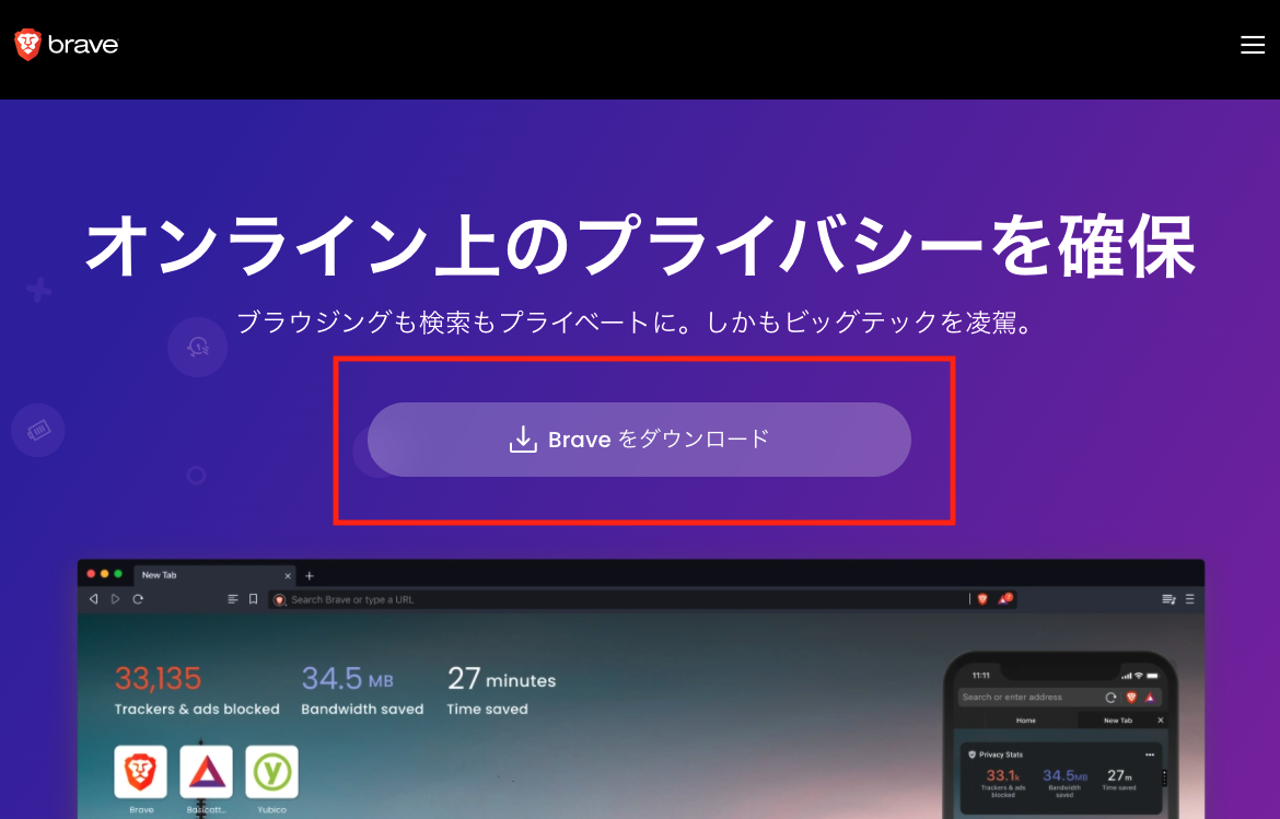 まずは公式サイトから「Brave」をインストールします。