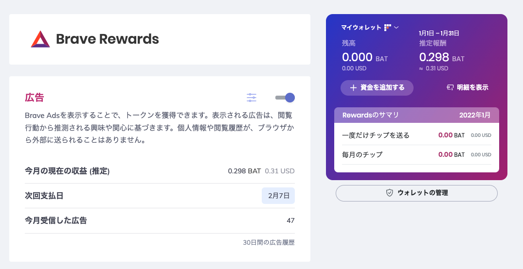 BraveでWebサイトを視聴するだけで、Braveが独自に発行している「BAT」という仮想通貨を貯めることができます。仮想通貨取引サービスを利用していると、貯めたBATをBTC(ビットコイン)に変換することも可能です。